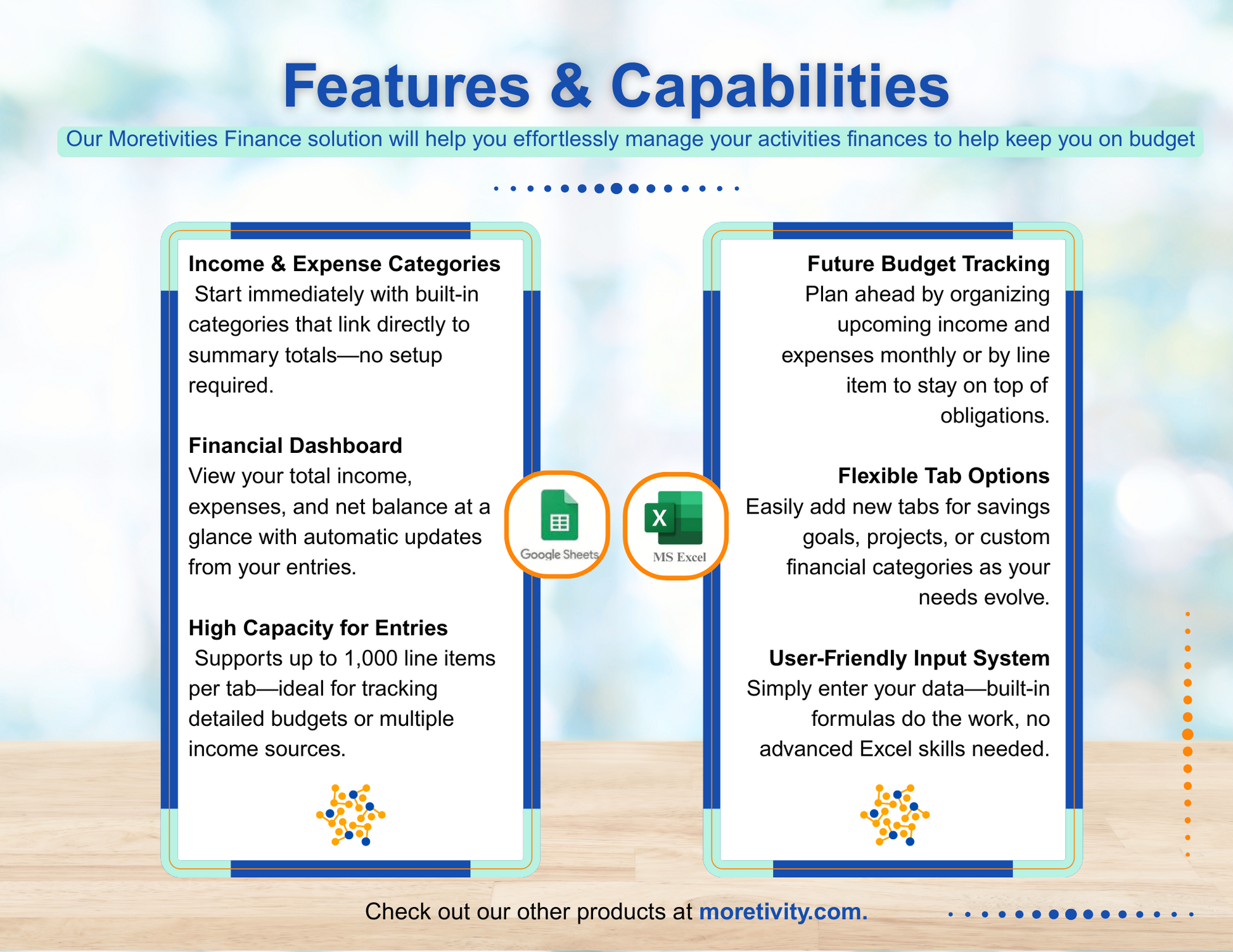 Greetings and Salutations! Welcome to Moretivity, your premier activity planning solution. Our Moretivity Activity Finance solution will help you effortlessly manage your activities and sub activities finances, to keep your financial planning simple, stress free and at your finger tips.